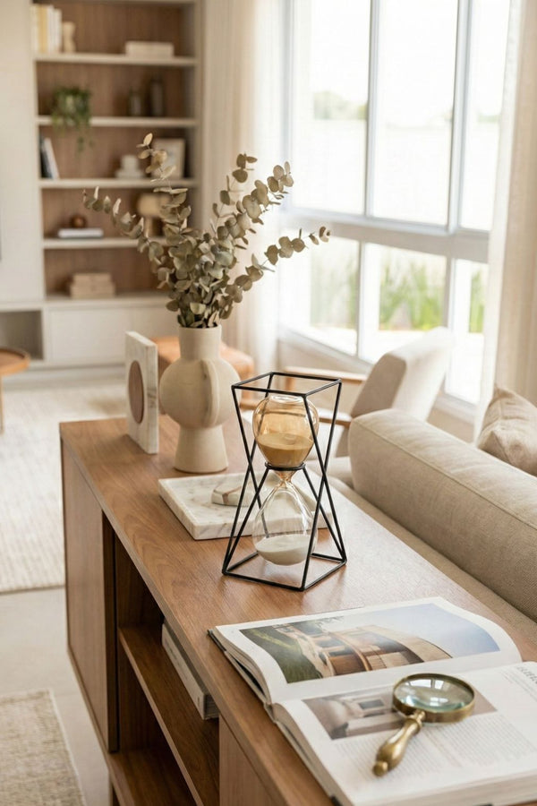 Com medidas de 19x14,5cm, esta peça é compacta, porém impactante, ideal para elevar o visual de escritórios, estantes, aparadores e mesas laterais. O contraste entre a areia e a estrutura escura cria um ponto de interesse visual elegante, adaptando-se perfeitamente a ambientes de estilo industrial, moderno ou escandinavo.