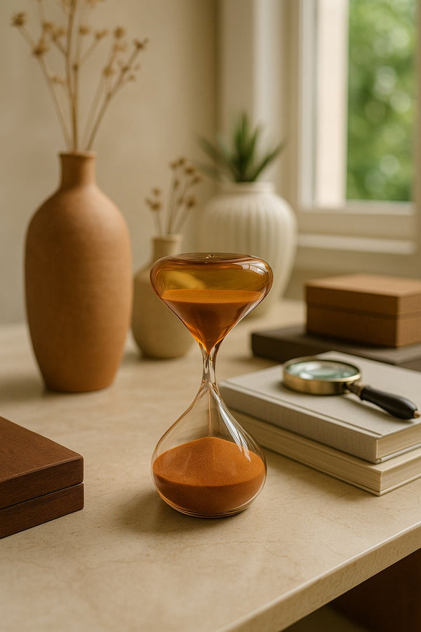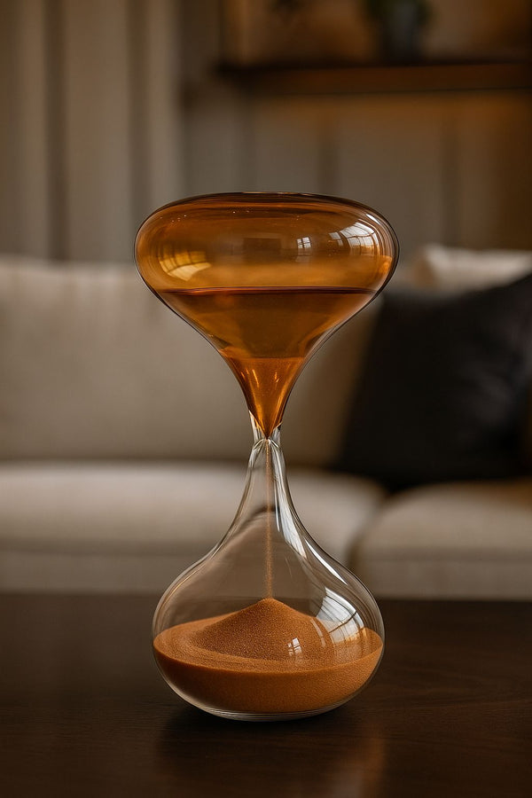 A Ampulheta Martin é uma peça que une estética e simbolismo em um único objeto decorativo. Fabricada em vidro soprado de alta transparência, ela revela um elegante fluxo de areia em tom âmbar que cria um jogo visual quente e sofisticado, evocando a passagem do tempo de forma poética e contemplativa.