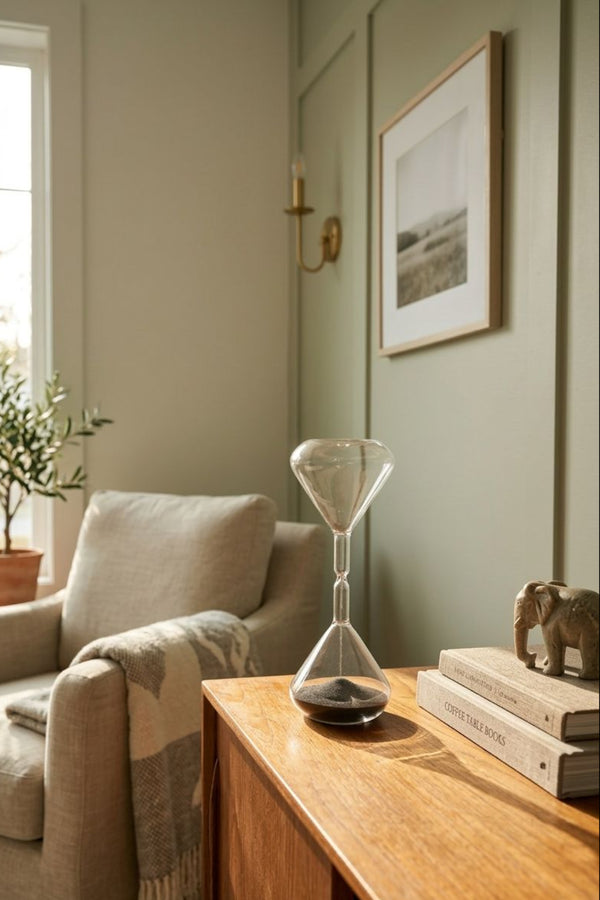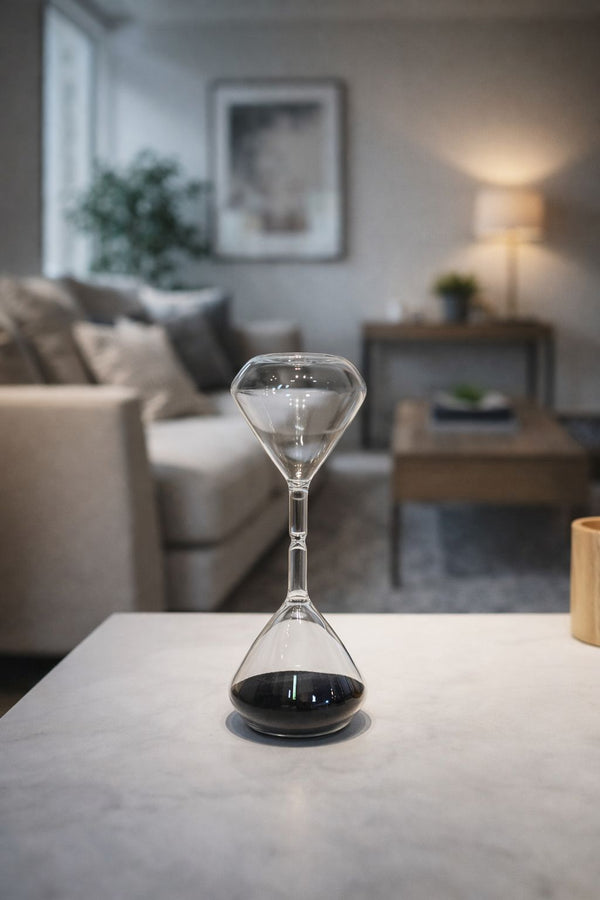 A ampulheta Tempo Nero é uma peça que traduz elegância e contemplação em forma de design. Produzida em vidro transparente com acabamento delicado, ela revela o fluxo suave da areia negra, criando um contraste sofisticado que transforma a passagem do tempo em um elemento decorativo de grande impacto visual.
