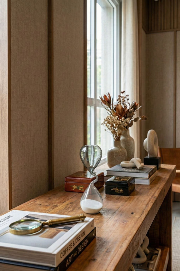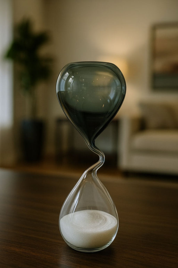 A Ampulheta Twist é a união perfeita entre funcionalidade e arte moderna. Seu grande diferencial está na elegante torção central do vidro, que conecta o topo em tom cinza fumê à base cristalina, criando um efeito visual fluido e sofisticado. Com medidas compactas, é a peça ideal para compor "bookshelves" (estantes de livros), mesas laterais ou sobrepor livros de arte, adicionando movimento e um toque contemporâneo à decoração.