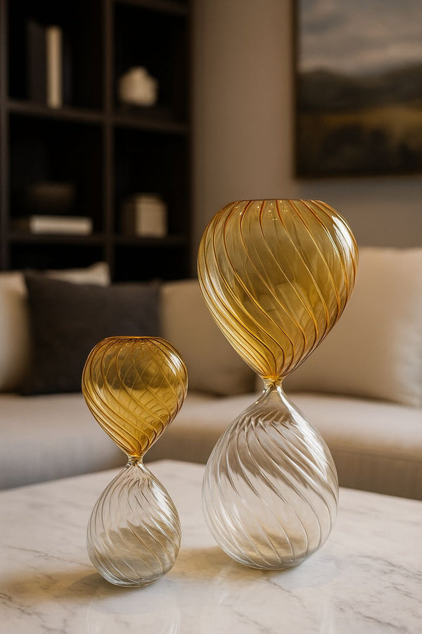 As Ampulhetas Claravia traduzem o tempo como caminho e contemplação. Confeccionadas em vidro puro, revelam a fluidez da areia que escorre em ritmo constante, criando uma paisagem silenciosa e luminosa — quase meditativa. Seu design limpo e delicadamente equilibrado faz com que a luz percorra a peça com suavidade, realçando a transparência e a leveza do movimento interno.