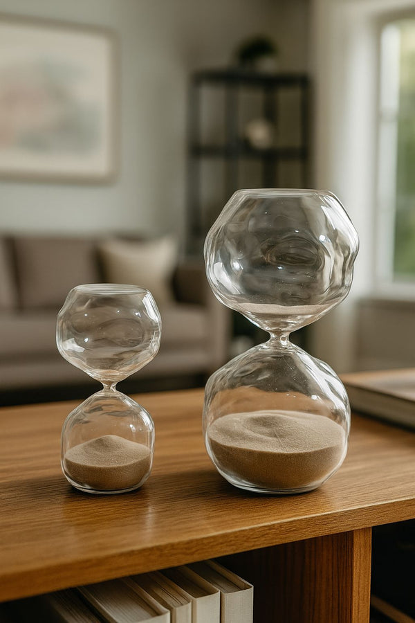 As Ampulhetas Lissandra traduzem a poesia do tempo em uma forma orgânica e sofisticada. Moldadas em vidro, apresentam curvas suaves que refletem a luz de maneira delicada, criando um efeito visual contemporâneo e elegante. A areia mineral clara reforça a estética minimalista, tornando o conjunto uma peça versátil para enriquecer composições em estantes, mesas laterais ou aparadores.