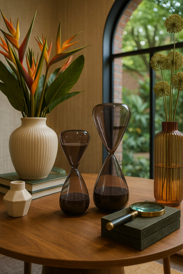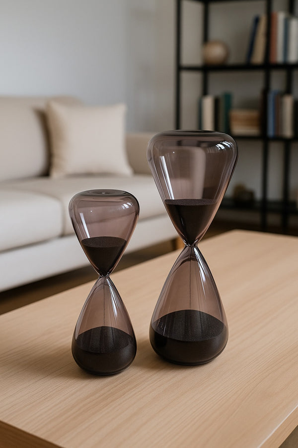 As Ampulhetas Nublo trazem a suavidade dos instantes e a beleza da pausa. Produzidas em vidro delicadamente tonalizado, apresentam uma transparência envolvente que contrasta com a areia escura, criando um movimento silencioso e poético. Suas formas fluidas evocam leveza, enquanto a paleta neutra permite composições elegantes em salas de estar, escritórios, mesas de centro ou estantes decoradas.