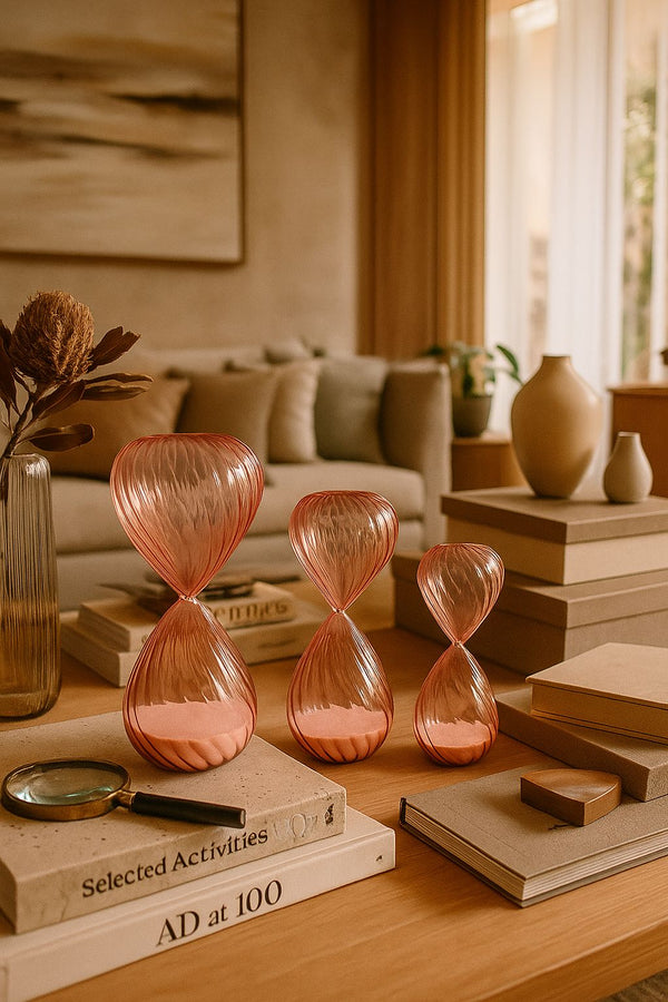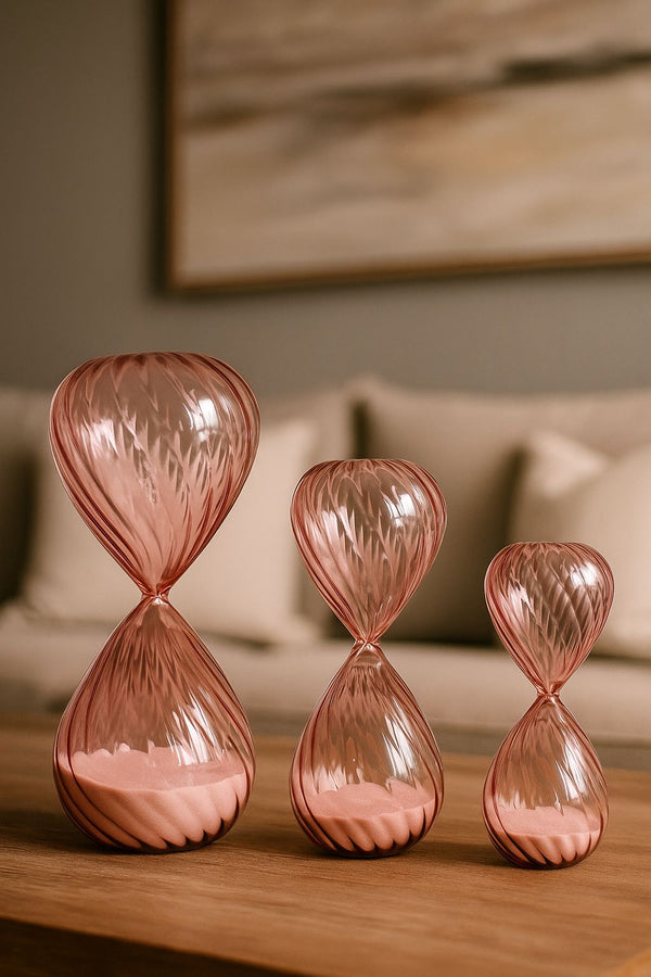 O trio Rosalia reúne três ampulhetas em vidro com acabamento facetado, revelando um jogo de luz sofisticado e uma tonalidade rosé suave que adiciona feminilidade e delicadeza ao décor. A areia em tom blush reforça a estética refinada das peças, transformando o tempo em um elemento visual, quase escultural.