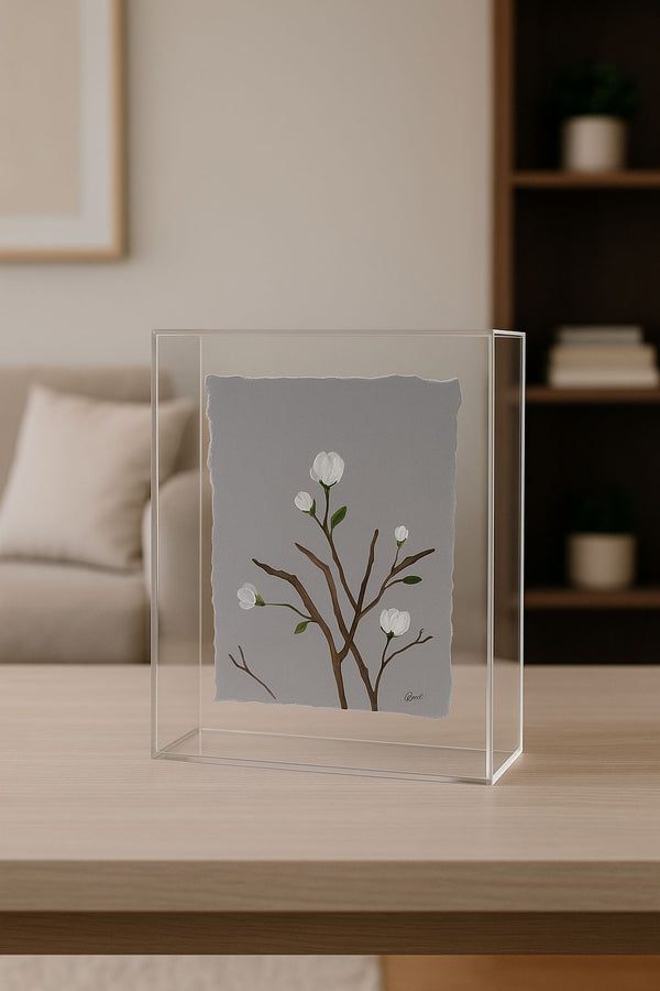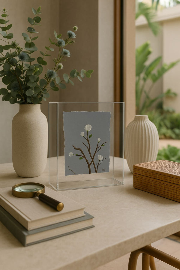 A obra Jardim Suspenso, assinada pela talentosa artista plástica Julyana Ghisolfi, é uma celebração da delicadeza da natureza preservada em arte. Envolta em uma sofisticada caixa de acrílico transparente, a pintura revela ramos floridos que parecem flutuar no espaço, criando a sensação de um jardim etéreo, intocado pelo tempo.