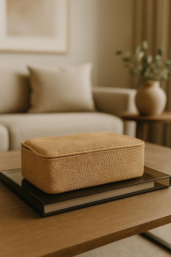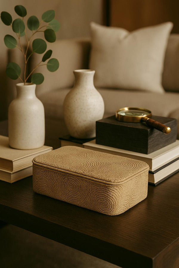 Seu acabamento em espirais concêntricas remete ao movimento da natureza e das formas ancestrais, conferindo personalidade e textura ao ambiente. As nuances em tom areia reforçam sua versatilidade e tornam a peça ideal para composições sobre mesas de centro, estantes, aparadores ou bandejas decorativas.