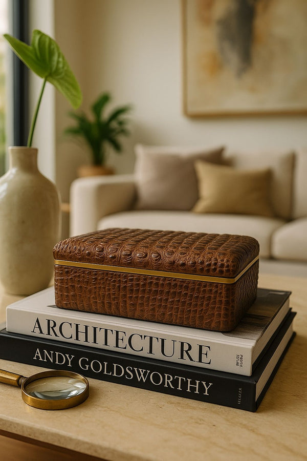 A Caixa Crocodile é um objeto de decoração sofisticado, criado para quem busca elegância com personalidade. Seu revestimento em poliresina com textura crocodilo em tom castanho profundo confere um visual imponente e luxuoso, enquanto o detalhe metálico dourado emoldura a peça com um toque contemporâneo e refinado.