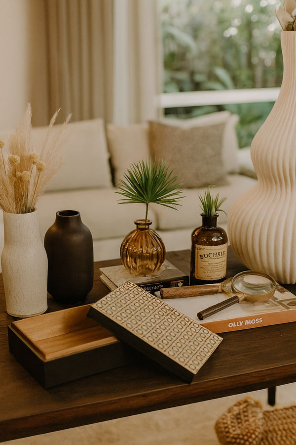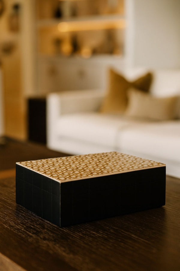 A Caixa Siena traduz a harmonia entre o design contemporâneo e o toque artístico da decoração refinada. Seu tampo apresenta um elegante padrão geométrico em relevo dourado, que contrasta com a base em tom escuro fosco, criando uma composição equilibrada e sofisticada. Com interior revestido e acabamento impecável, é perfeita para guardar pequenos objetos com discrição e estilo, ao mesmo tempo em que enriquece aparadores, mesas de centro ou prateleiras com sua presença elegante e atemporal.