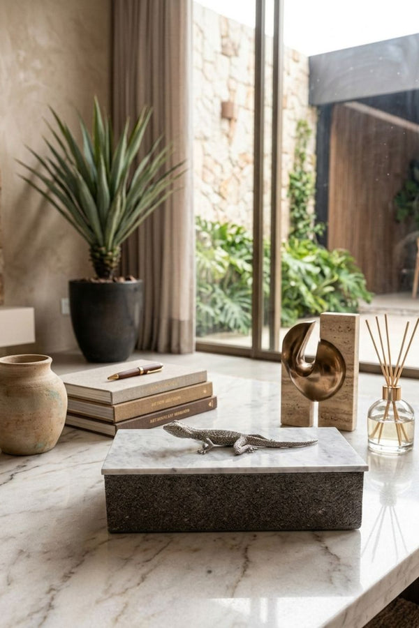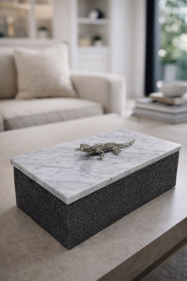 No topo, uma escultura metálica de lagarto cuidadosamente trabalhada adiciona personalidade e exclusividade à peça, transformando a caixa em um verdadeiro objeto de destaque na decoração. A composição de materiais nobres e texturas distintas cria um efeito visual sofisticado, ideal para compor aparadores, mesas de centro, estantes ou escritórios elegantes.