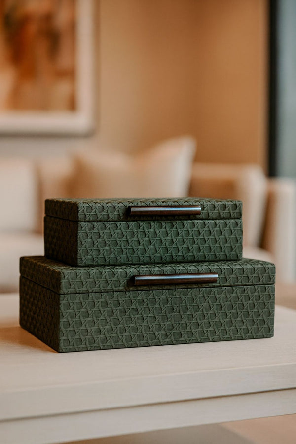 As Caixas Decorativas Trama Verde são peças que unem funcionalidade e sofisticação. Confeccionadas em MDF de alta qualidade e revestidas com um delicado padrão geométrico em tom verde elegante, elas elevam a estética de qualquer ambiente. A caixa maior mede 25 × 8 cm, enquanto a menor possui 20 × 7 cm, tornando o conjunto perfeito tanto para organizar pequenos objetos quanto para enriquecer a decoração de salas de estar, escritórios ou estantes sofisticadas. O detalhe metálico no puxador acrescenta um toque de requinte, transformando cada caixa em um elemento decorativo contemporâneo e atemporal.