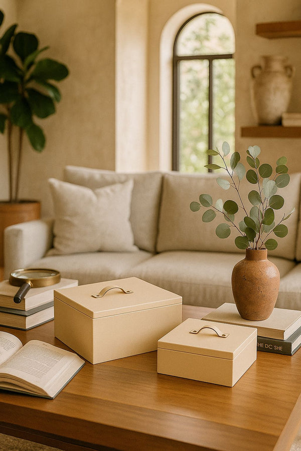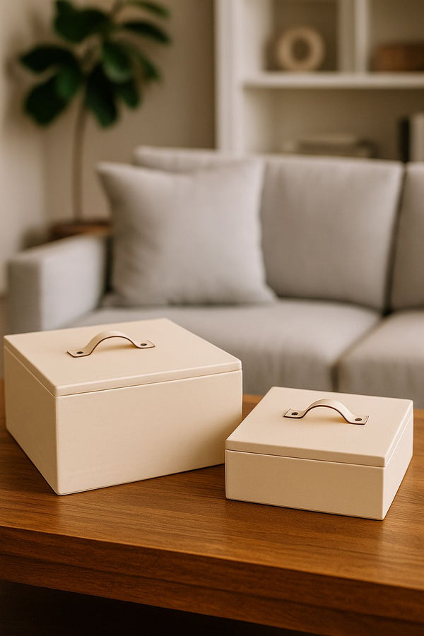 As Caixas Latte trazem a sofisticação dos tons cremosos e neutros para a decoração, combinando design minimalista com acabamento laqueado fosco em um elegante tom latte — suave, acolhedor e atemporal. Suas alças em couro ecológico adicionam um toque de refinamento orgânico, tornando-as perfeitas para compor mesas de centro, aparadores, estantes ou escritórios de forma discreta e elegante.