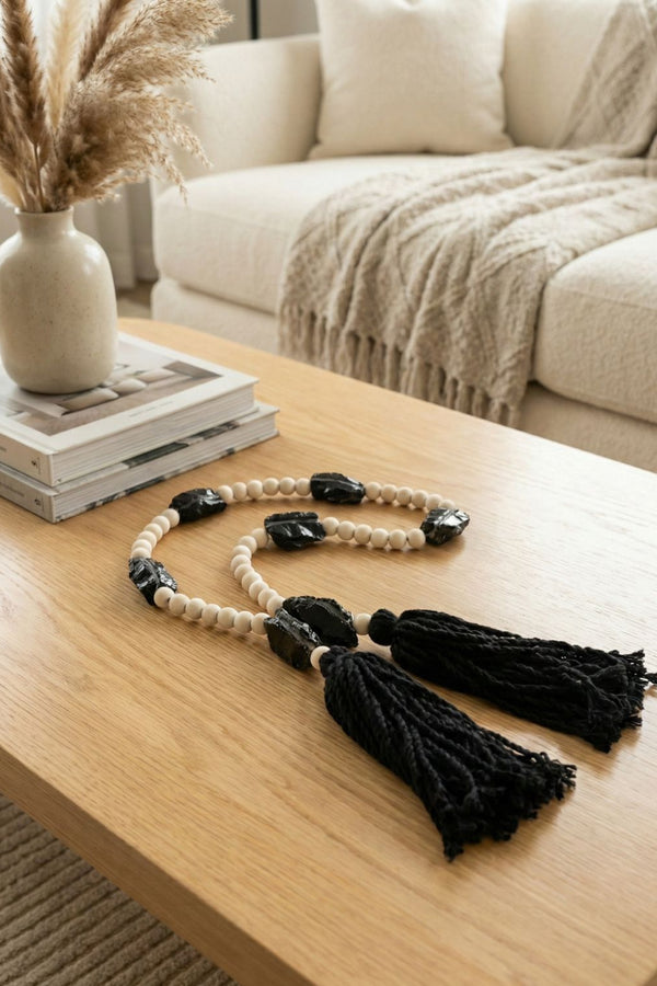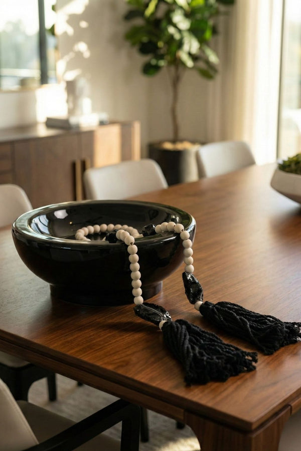 O Centro de Mesa Valon combina elegância contemporânea e presença escultural em uma única peça. Seu corpo em cerâmica esmaltada revela um brilho profundo e uniforme, criando um ponto focal sofisticado que dialoga perfeitamente com o colar decorativo de 125 cm, composto por contas lisas e tassels em fio trançado de acabamento impecável.
