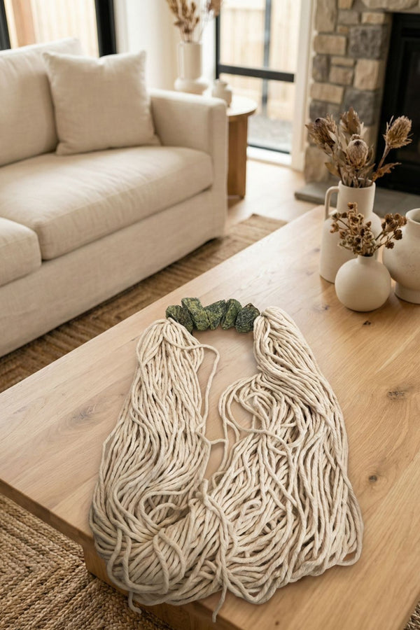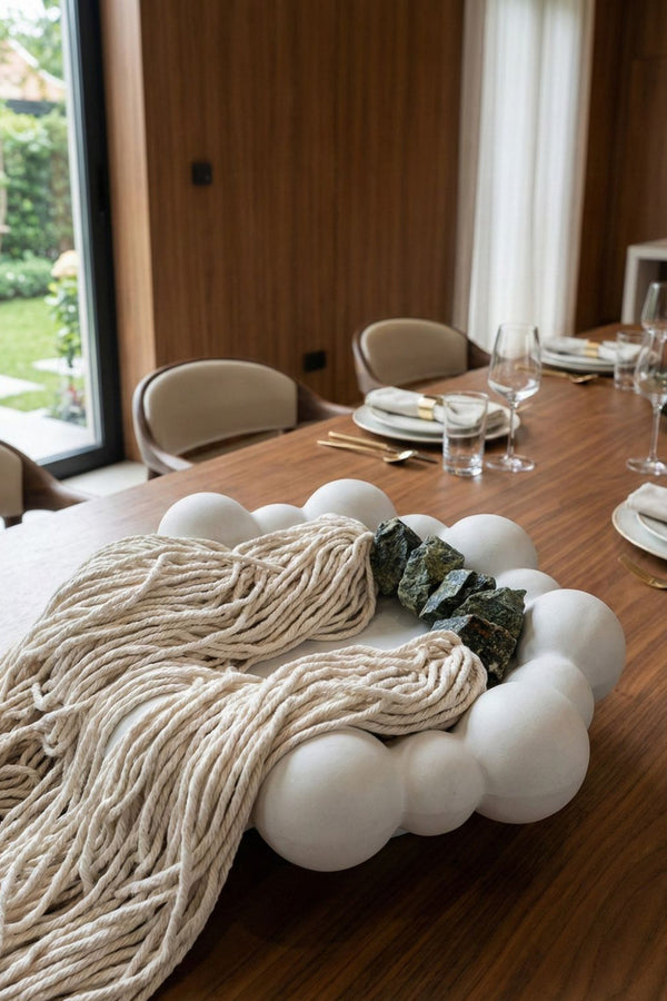 O Centro de Mesa Nuvia traduz leveza e elegância em uma peça de expressão artística. Seu formato orgânico, composto por volumes suaves em cerâmica premium, evoca a delicadeza das formas naturais, criando um visual etéreo e contemporâneo. O colar têxtil de 50 cm, adornado por pedras naturais, acrescenta movimento, textura e um toque artesanal que enriquece a composição.