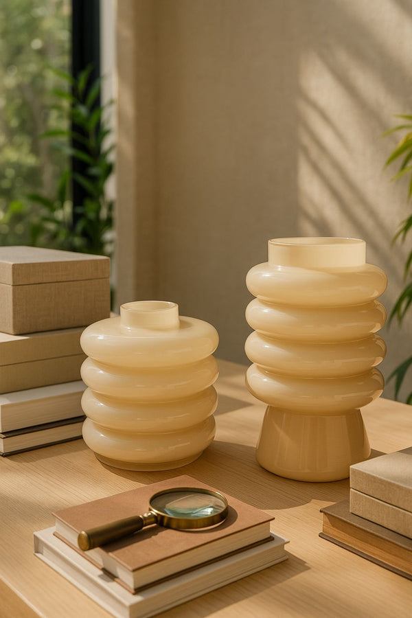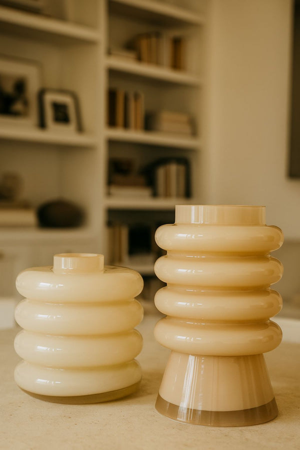 A Coleção Ondaris celebra a fluidez das formas orgânicas por meio de dois vasos esculpidos em vidro soprado, apresentados em um elegante tom baunilha translúcido. Suas camadas onduladas criam um desenho contínuo e envolvente, revelando volumes que dialogam com a luz e acrescentam profundidade à composição.