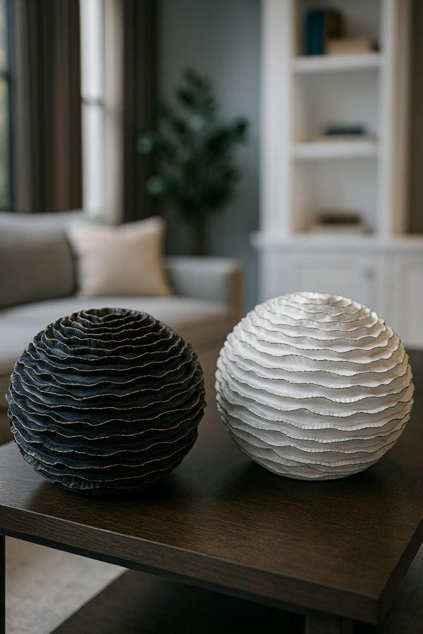 Com 23 × 20 cm, cada peça se destaca como um ponto de elegância tátil, combinando presença artística e versatilidade decorativa. Disponíveis em versões contrastantes — uma em tonalidade clara, suave e luminosa; outra em acabamento escuro com delicados realces — compõem um conjunto harmônico que valoriza mesas, aparadores, estantes e composições sofisticadas