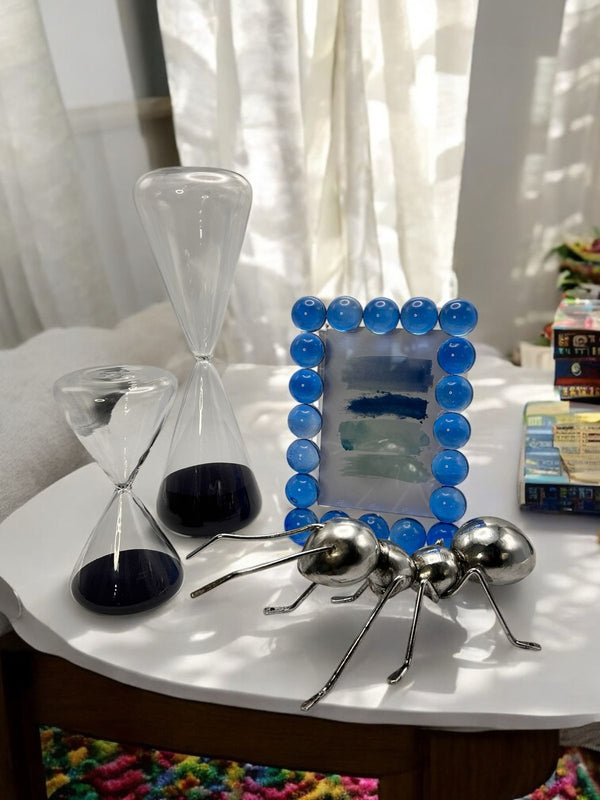 Kit Decorativo Bubble Time – Formiga Metálica, Porta-Retrato e Ampulhetas