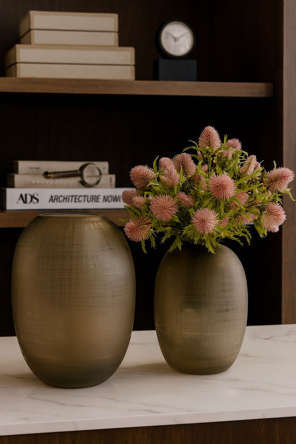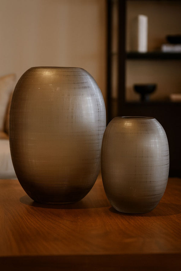 O Conjunto de Vasos Vellare é a expressão máxima da sofisticação minimalista. Com linhas suaves e acabamento fumê delicadamente texturizado, suas superfícies revelam uma trama sutil que reflete a luz com elegância e profundidade. Feitos em vidro translúcido, os vasos exibem uma estética atemporal que se adapta com naturalidade a ambientes modernos ou clássicos.
