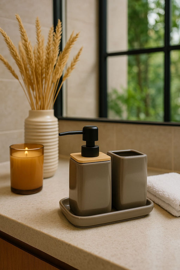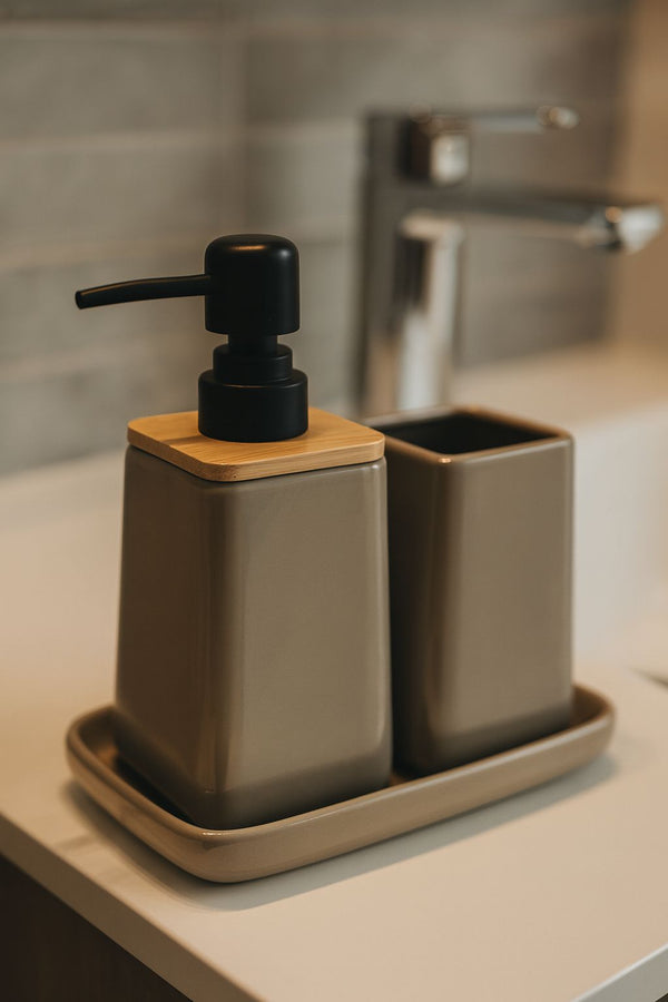 O Conjunto Domo é uma expressão de equilíbrio entre forma e função. Produzido em cerâmica esmaltada de tonalidade taupe, transmite sobriedade e sofisticação, enquanto os detalhes em bambu natural acrescentam um toque orgânico e acolhedor. A bandeja de apoio garante praticidade e organização, mantendo todos os itens em perfeita harmonia. Com dimensões de 18,5x17cm, este conjunto é ideal para compor ambientes que prezam por estética contemporânea e funcionalidade refinada, tornando o espaço mais elegante e acolhedor.