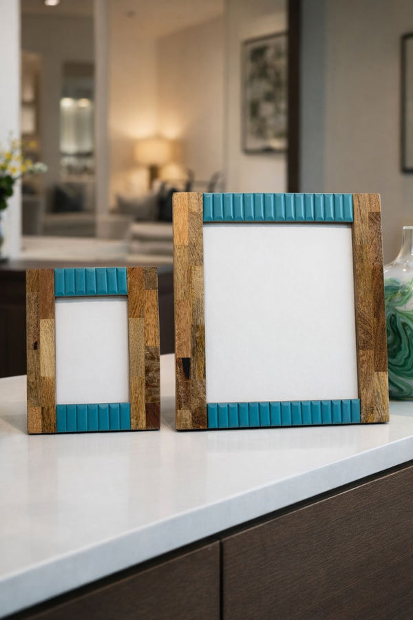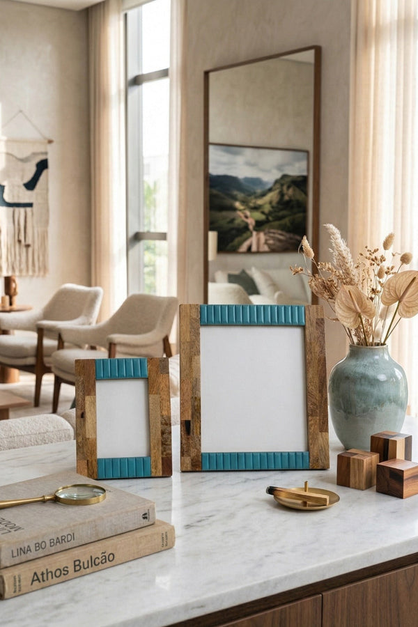 O Porta-Retratos Ravello combina o calor da madeira natural com o toque contemporâneo da resina azul texturizada, criando uma moldura sofisticada e cheia de personalidade. Seu design equilibra elementos naturais e modernos, tornando a peça perfeita para destacar fotografias e lembranças importantes.
