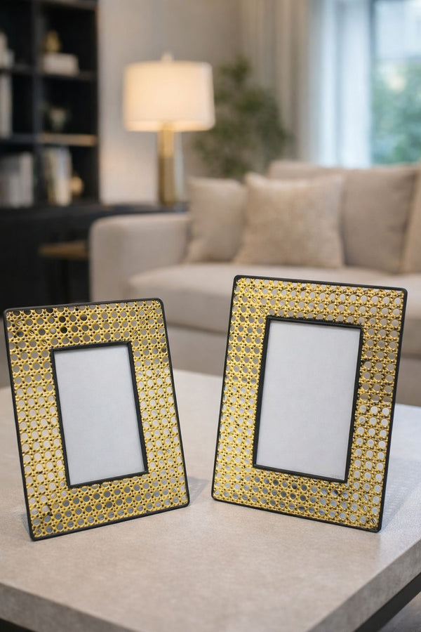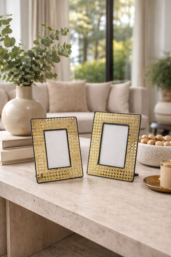 O Porta-Retratos Lattice é a união entre design contemporâneo e elegância atemporal. Sua estrutura em metal dourado com trama vazada de círculos cria um efeito artístico e sofisticado, enquanto a moldura preta adiciona contraste e profundidade visual à peça.