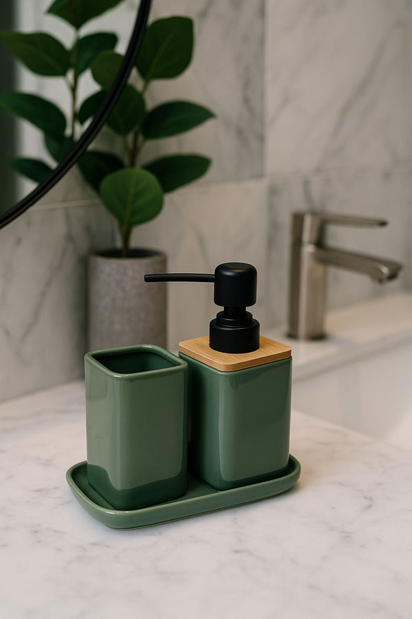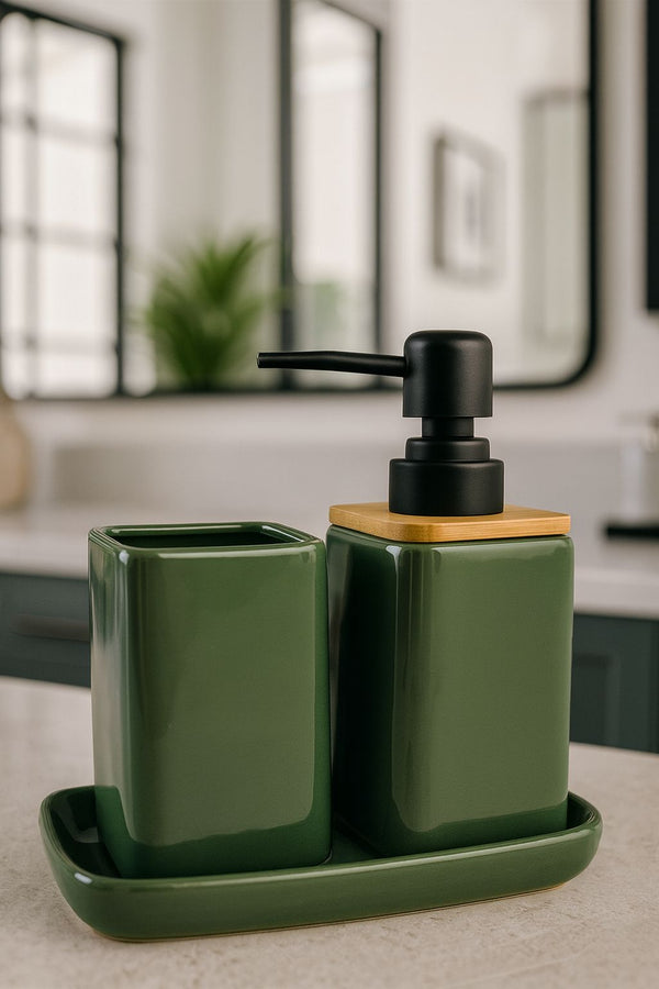 O Conjunto Verona Verde é a união perfeita entre funcionalidade e sofisticação para o seu ambiente. Produzido em cerâmica de alta qualidade, com acabamento esmaltado em tom verde elegante, traz um toque natural e moderno com o detalhe em bambu na tampa do dispenser e o acionador em plástico ABS preto fosco. Ideal para organizar o banheiro com estilo, o conjunto inclui um porta-escova e um dispenser para sabonete líquido, ambos dispostos sobre uma base coordenada que garante praticidade e charme na sua rotina diária.