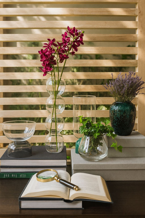 A versão menor (13 × 11 cm), com base acinzentada e cúpula arredondada, é ideal para composições discretas ou como peça solitária de destaque. O vaso médio (24,5 × 9 cm), alto e orgânico, valoriza arranjos verticais como hastes de orquídeas ou flores minimalistas. Já o maior (29,5 × 8 cm), com base verde esmeralda, equilibra a composição e convida a experimentações com folhagens ou elementos naturais.