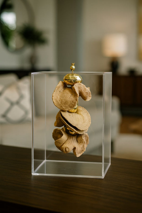 A Escultura Teyna traduz a leveza do movimento e a harmonia da natureza em uma peça de design sofisticado. Dentro de sua estrutura em acrílico cristalino, elementos orgânicos preservados dialogam com detalhes metálicos dourados, criando um contraste elegante e atemporal. Com dimensões de 20,5 × 13 cm, esta obra se adapta com maestria a estantes, aparadores e mesas de centro, conferindo um ar de exclusividade e refinamento ao ambiente. Um detalhe artístico que transforma o espaço em uma verdadeira expressão de estilo e bom gosto.