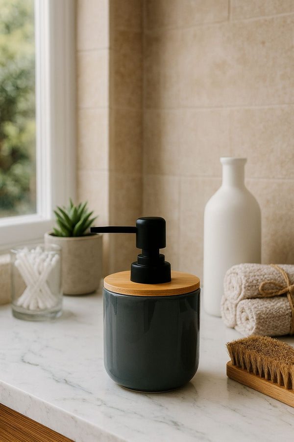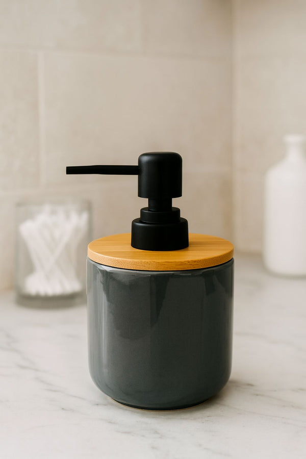 O Dispenser Grafite é uma peça que une sofisticação e funcionalidade em um design contemporâneo. Suas medidas de 14,5 × 9 cm tornam-no ideal para banheiros e lavabos que valorizam a harmonia entre estética e praticidade. Confeccionado em cerâmica esmaltada, traz resistência e brilho elegante, enquanto a tampa em bambu natural adiciona calor e contraste ao conjunto. A bomba em preto fosco confere modernidade e robustez, resultando em um acessório refinado que se integra com facilidade a diferentes estilos de decoração.