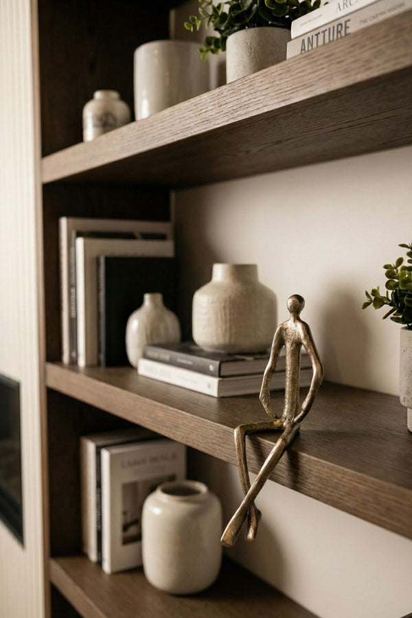 A Escultura Altavento traduz a elegância do movimento em uma forma minimalista e atemporal. Suas linhas alongadas e o gesto sereno criam uma sensação de leveza, como se a figura repousasse sob uma brisa suave. Produzida em metal com acabamento dourado envelhecido, a peça revela textura refinada e um brilho sutil que enriquece qualquer composição decorativa.