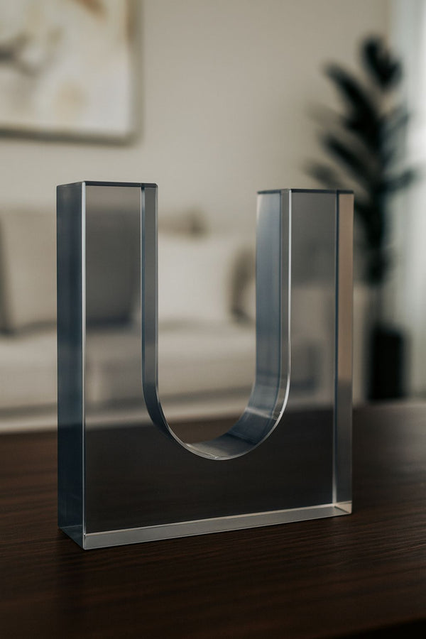 A Escultura Arcus traduz o encontro entre a pureza das formas e a elegância do design contemporâneo. Produzida em cristal, sua estrutura em formato de arco evoca harmonia e equilíbrio, refletindo a luz de maneira delicada e sofisticada.