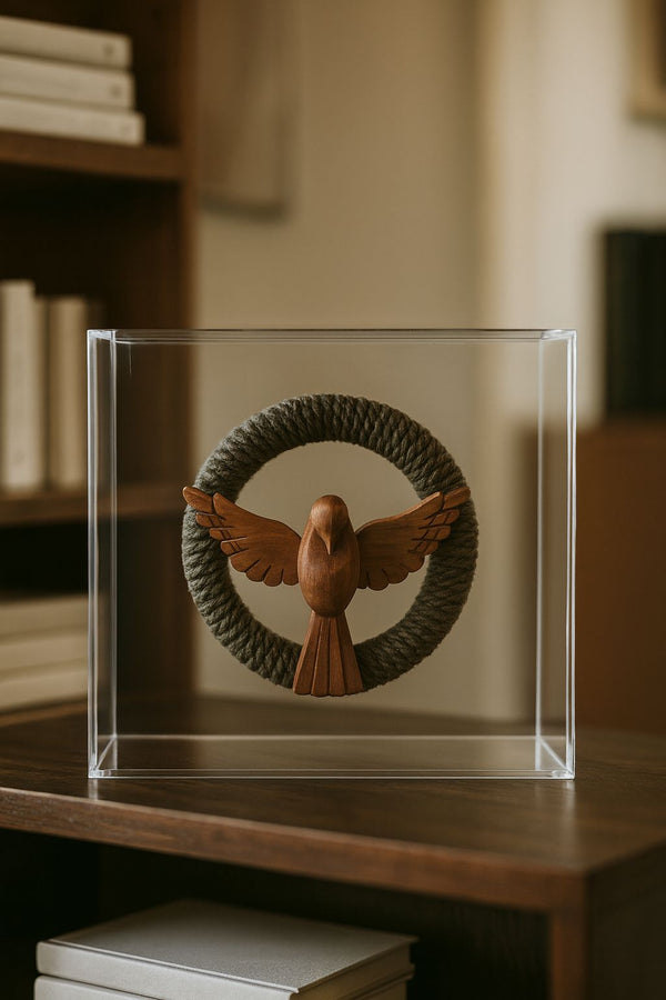 A Avestria é uma escultura que traduz equilíbrio, harmonia e presença. A ave em madeira entalhada, de asas abertas, representa movimento e liberdade, enquanto o aro revestido em corda natural evoca aconchego, textura e conexão com elementos orgânicos.