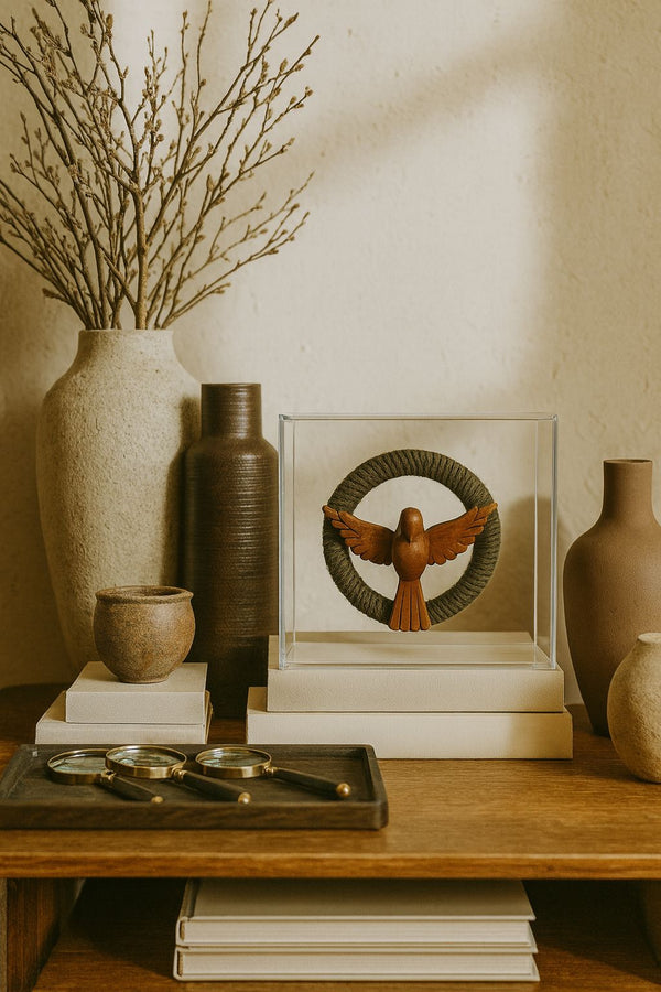 Protegida por uma caixa em acrílico cristal, a peça assume caráter de obra de galeria — elegante, leve e atemporal. Ideal para composições sobre aparadores, estantes e mesas decorativas, trazendo uma atmosfera serena e sofisticada ao ambiente.