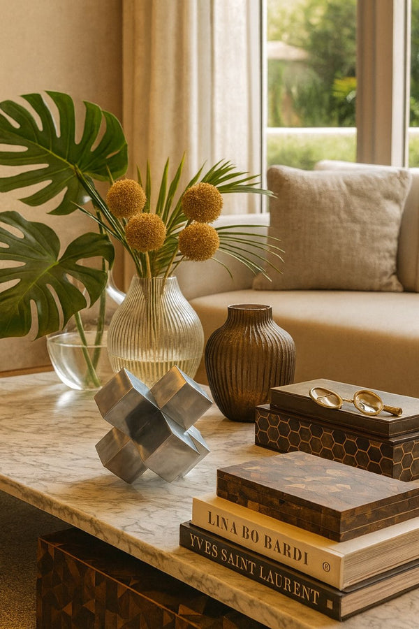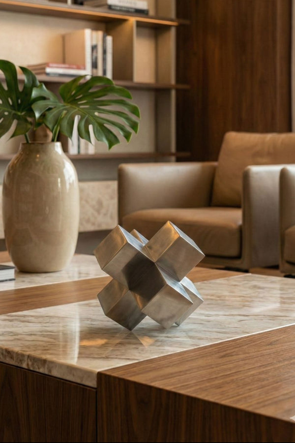 A Escultura Axion traduz a força do design geométrico em uma peça compacta e extremamente elegante. Com 11 × 11 cm, sua estrutura composta por blocos metálicos entrelaçados cria um ponto focal moderno, capaz de enriquecer mesas, estantes ou aparadores com um toque de precisão arquitetônica. Seu acabamento em metal polido reflete delicadamente a luz, valorizando composições contemporâneas e adicionando sofisticação discreta ao ambiente. Ideal para quem busca uma peça decorativa de presença marcante e estética minimalista.