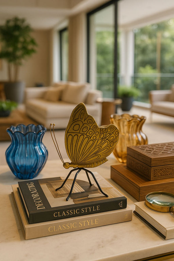 A Escultura Farfalla encanta pela leveza das formas e pela riqueza dos detalhes que remetem à delicadeza de uma borboleta em pleno voo. Com estrutura em metal e acabamento dourado envelhecido, a peça revela um brilho elegante que se harmoniza facilmente com diferentes estilos de decoração — do clássico ao contemporâneo. A base em ferro preto confere equilíbrio visual e estabilidade, destacando ainda mais o contraste entre o dourado e o preto.