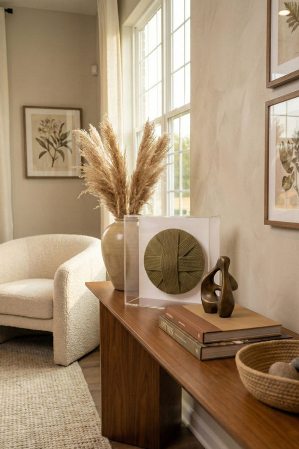 Eleve o nível da sua decoração com a Escultura Globe. Esta peça de design autoral captura a tendência do organic modern, unindo a textura tátil e aconchegante da corda náutica em verde musgo com a sofisticação clean do acrílico.