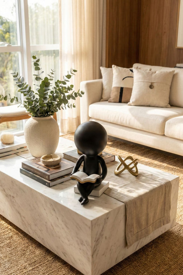 A Escultura Leggio traduz com delicadeza a poética do ato de ler. Em resina de acabamento negro fosco, a figura minimalista repousa em postura serena com um livro aberto entre as mãos, simbolizando curiosidade intelectual, silêncio e contemplação.