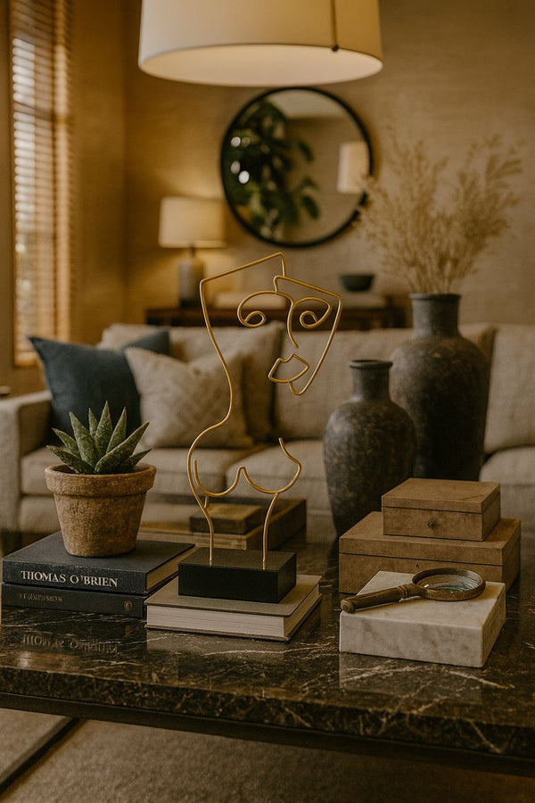 Com traços contínuos e sinuosos, a Escultura Linearte revela a beleza do minimalismo escultórico em sua forma mais elegante. O desenho fluido em metal dourado cria a ilusão de um rosto abstrato e orgânico, evocando leveza, movimento e personalidade. Fixada sobre uma base robusta em resina de acabamento impecável, a peça se destaca como um ponto de equilíbrio entre arte contemporânea e sofisticação decorativa.