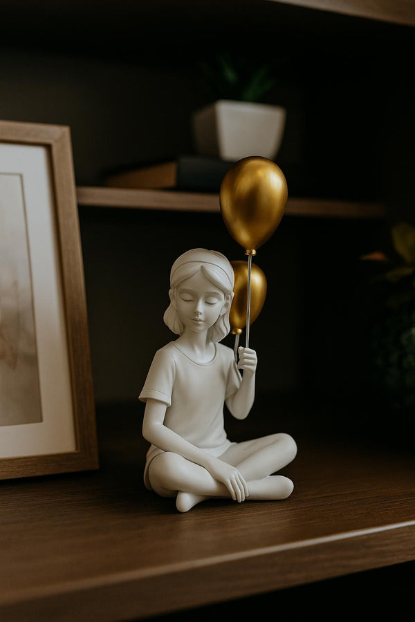 Transforme o ambiente da sua casa ou escritório com esta sofisticada escultura decorativa. Com 22 cm de altura e 7,5 cm de diâmetro, ela combina elegância e modernidade em um design único. A peça apresenta uma figura feminina minimalista em tom branco fosco, segurando balões dourados brilhantes que adicionam um toque de luxo e originalidade.
