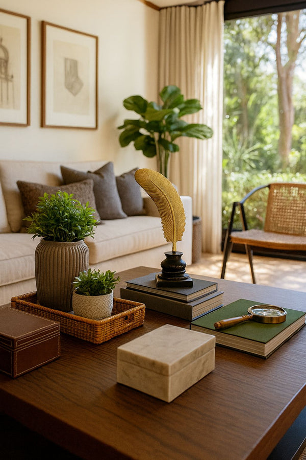 A Escultura Pluma encanta pela delicadeza das formas e pela sofisticação do acabamento dourado que remete à leveza e à inspiração criativa. Assentada sobre uma base em tom negro envelhecido, a peça ganha destaque e profundidade, tornando-se um ponto de elegância em qualquer composição. Com 26x14cm, é ideal para adornar mesas de centro, aparadores ou estantes, agregando um toque artístico e refinado a ambientes contemporâneos ou clássicos.