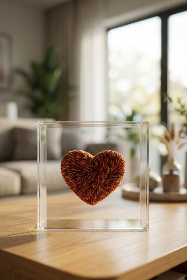 A Escultura Pulso traduz a vitalidade e o movimento em uma peça de design estático e elegante. Seu núcleo apresenta um coração organicamente tramado em fios coloridos, criando uma textura visual rica que contrasta perfeitamente com a geometria limpa e minimalista do cubo de acrílico que o protege.