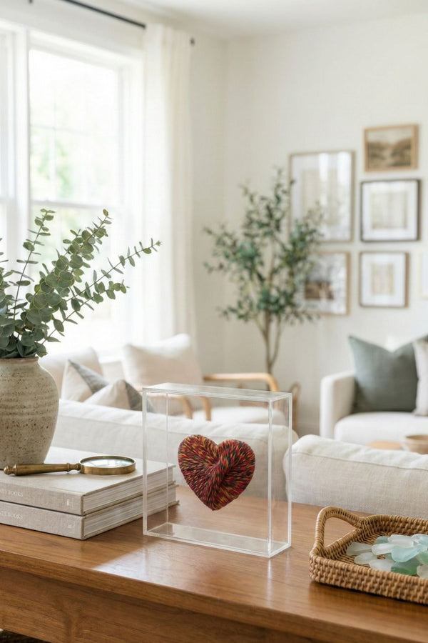 O design transparente permite que a trama pareça flutuar, capturando a luz e o olhar de qualquer ângulo, simbolizando um sentimento que vibra no centro do ambiente. Com dimensões compactas de 13,5 x 13,5 cm, é a peça ideal para adicionar personalidade e um toque de arte contemporânea a mesas de centro, nichos iluminados ou sobre livros em uma mesa lateral (bookshelf wealth), equilibrando modernidade com o calor do trabalho manual.
