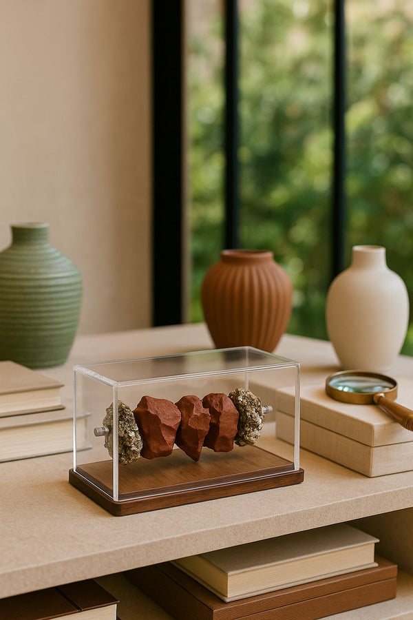 A Escultura Rubeus é uma peça de expressão mineral sofisticada, unindo o vermelho terroso do jaspe bruto ao brilho metálico da pirita em um contraste visual de rara elegância. A obra é apresentada em caixa de acrílico cristal com base em madeira nobre, preservando a estética natural das pedras enquanto assume o papel de objeto decorativo de alto padrão.
