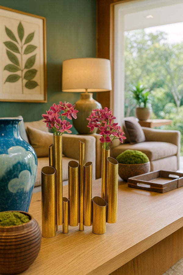 O Vaso Sinfonia Dourada é uma peça escultural que une sofisticação e originalidade em cada detalhe. Com seu design formado por tubos cilíndricos de diferentes alturas, evoca a harmonia de uma sinfonia visual, transformando qualquer ambiente em uma verdadeira galeria de arte. Produzido em metal com acabamento dourado elegante, apresenta dimensões imponentes de 36 × 26 cm, ideais para se destacar sobre aparadores, mesas de centro ou estantes modernas. Versátil, pode ser utilizado tanto como vaso para flores delicadas quanto como peça decorativa independente, agregando brilho e personalidade à decoração.