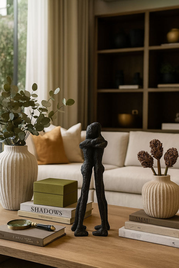 A Escultura Sintonia traduz, em formas delicadamente entrelaçadas, a perfeita harmonia entre dois seres que se conectam em equilíbrio e emoção. Com 49cm de altura, a peça destaca-se pela imponência de suas linhas contínuas e pela textura refinada do acabamento metálico escuro, que reflete a luz com sutileza e profundidade. Cada detalhe foi cuidadosamente elaborado para transmitir a sensação de união e cumplicidade, tornando-a uma obra que transcende o mero decorativo. Ideal para composições sofisticadas em aparadores, mesas de centro ou estantes, a Escultura Sintonia adiciona um toque de arte contemporânea e sentimento ao ambiente, evocando equilíbrio, afeto e elegância atemporal.