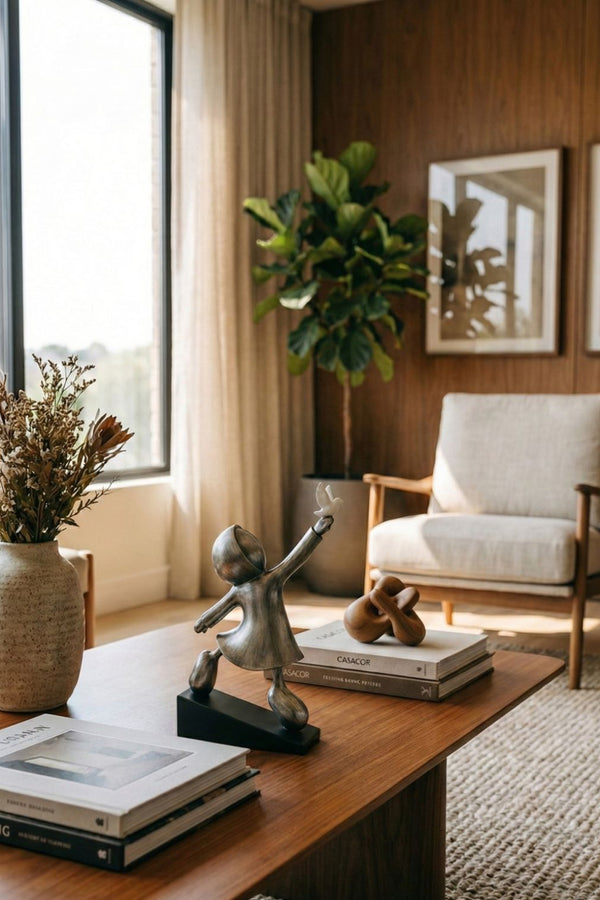 A Escultura Zenit é uma representação artística de aspiração e liberdade. Com design contemporâneo, a peça captura a silhueta estilizada em um gesto de elevação, guiando o olhar para o "zenite" — o ponto mais alto — onde uma delicada ave branca prepara-se para o voo. O contraste entre o acabamento prateado envelhecido do corpo, a leveza do pássaro e a geometria sólida da base preta confere à obra um equilíbrio visual sofisticado. Com medidas de 35x20cm, esta escultura possui a proporção exata para trazer personalidade e significado a mesas laterais, estantes, nichos ou aparadores em ambientes que prezam por elegância e modernidade.