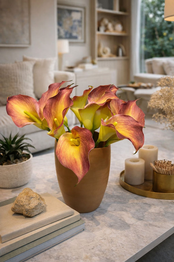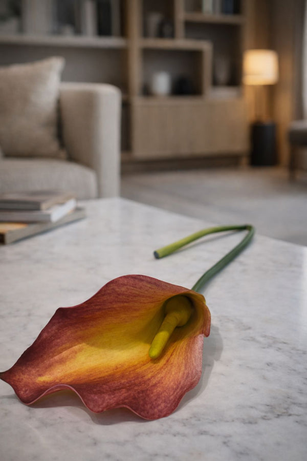A Folhagem Copo de Leite é uma peça decorativa que une naturalidade e sofisticação em um design clássico e atemporal. Com 47 cm de altura, sua estrutura alongada e pétalas em degradê - que transitam entre o dourado suave e o tom terroso queimado - criam um efeito visual marcante, elegante e acolhedor.