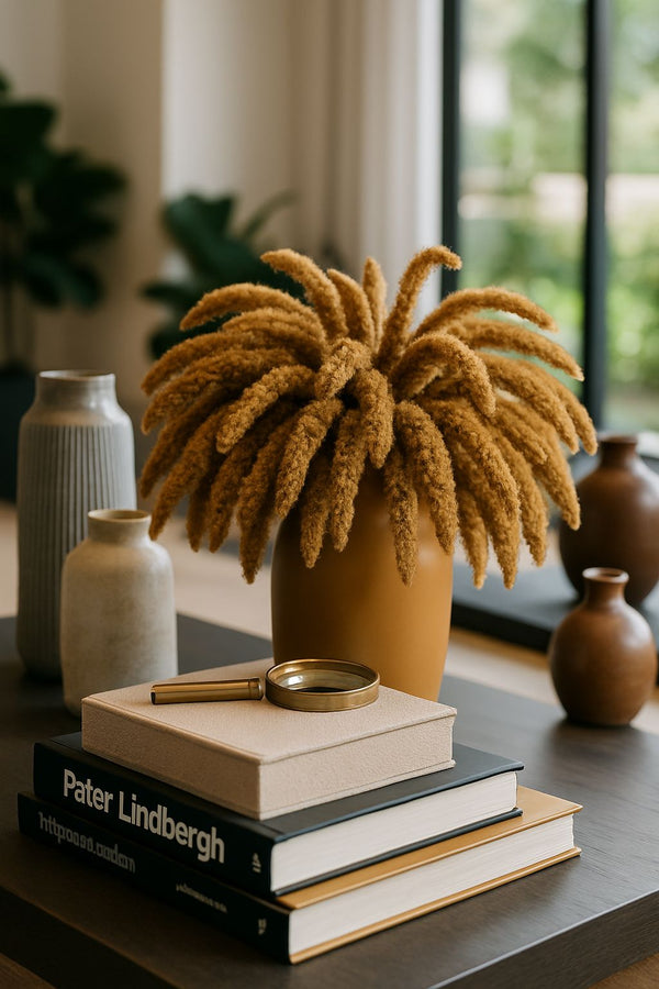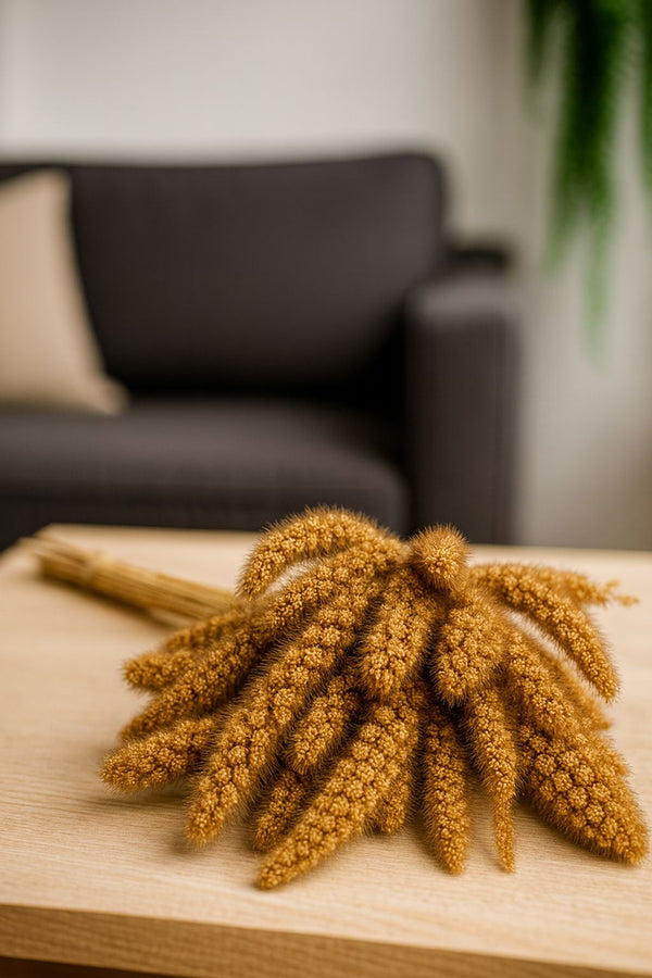 A Folhagem Trigo Ava é uma composição elegante de hastes longas e cheias, cuidadosamente desidratadas para preservar sua textura natural e seu tom dourado característico. Sua forma encorpada e orgânica acrescenta profundidade e movimento aos arranjos, evocando o charme do trigo colhido ao sol.