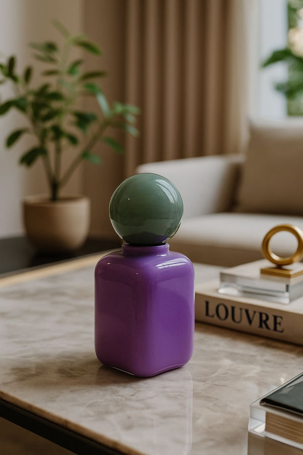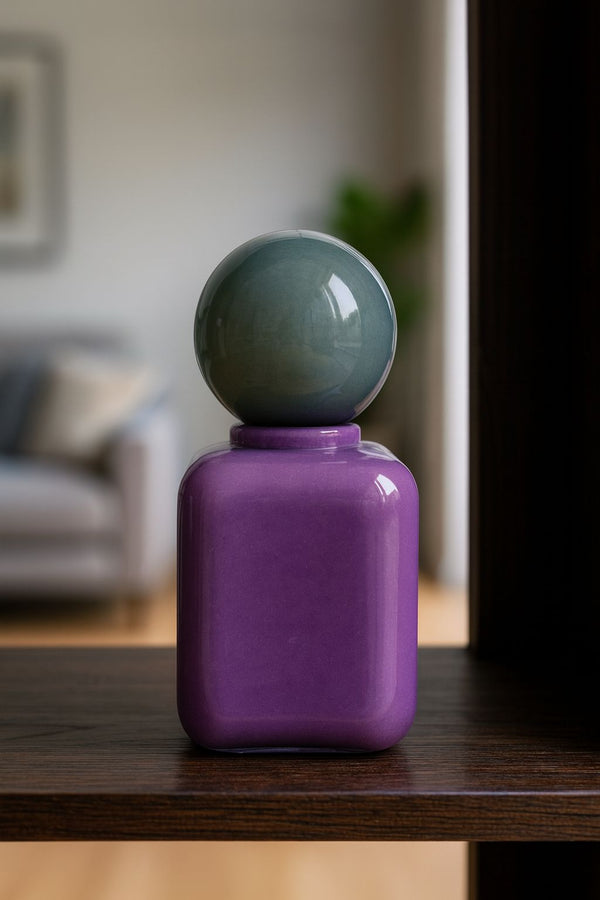 O Vaso Ametista é uma peça de decoração sofisticada e contemporânea, ideal para quem busca elegância e exclusividade. Seu corpo em um profundo tom ametista, aliado à esfera superior em vidro verde acinzentado, cria um contraste harmonioso e moderno.