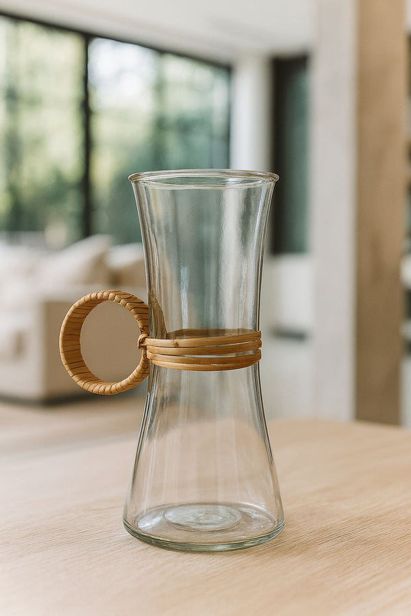 A Garrafa Luminare é a tradução da elegância natural em forma de arte. Produzida em vidro delicadamente moldado e envolta por detalhes em fibra natural, esta peça exibe um equilíbrio refinado entre o brilho translúcido e a textura orgânica.