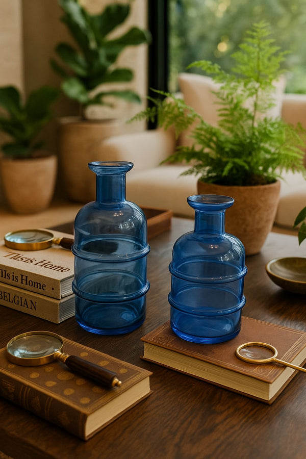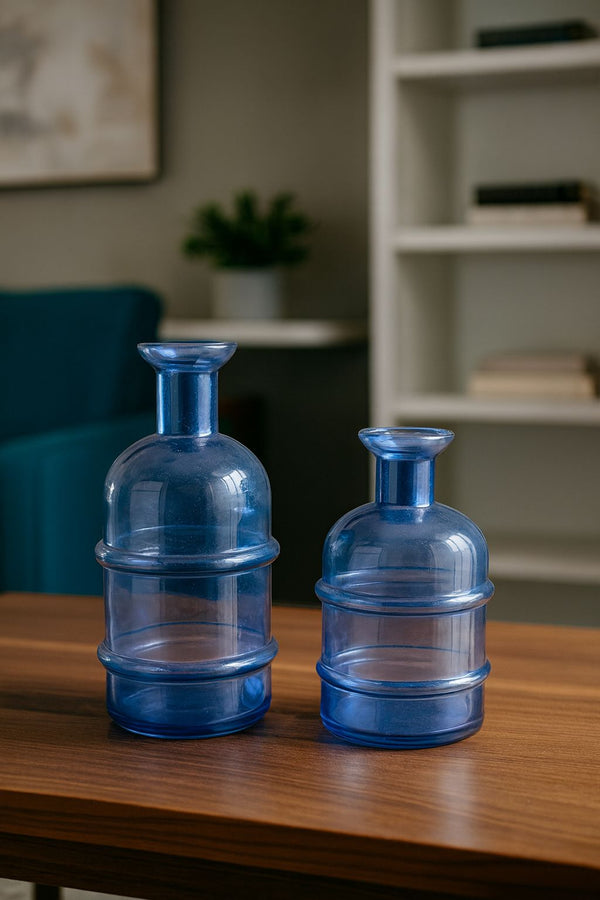 As Garrafinhas Lumiar são peças que traduzem delicadeza e sofisticação em cada detalhe. Seu vidro azul translúcido exibe reflexos suaves que variam conforme a iluminação, criando um jogo de luz e cor que confere dinamismo ao ambiente. Os anéis que percorrem sua estrutura adicionam textura e movimento, transformando o design em uma expressão de modernidade e elegância atemporal.